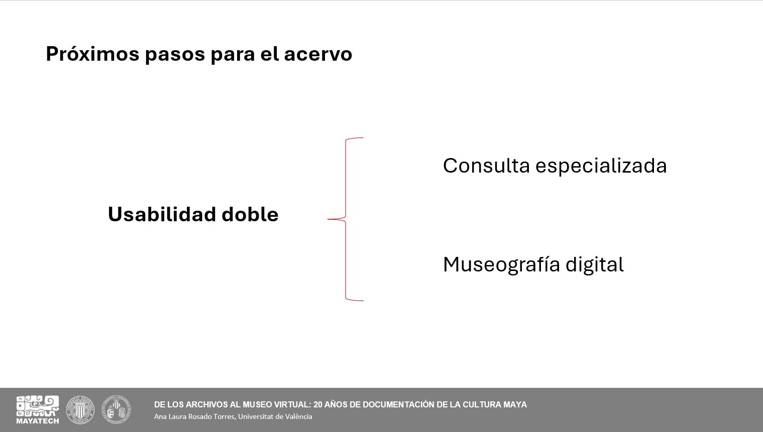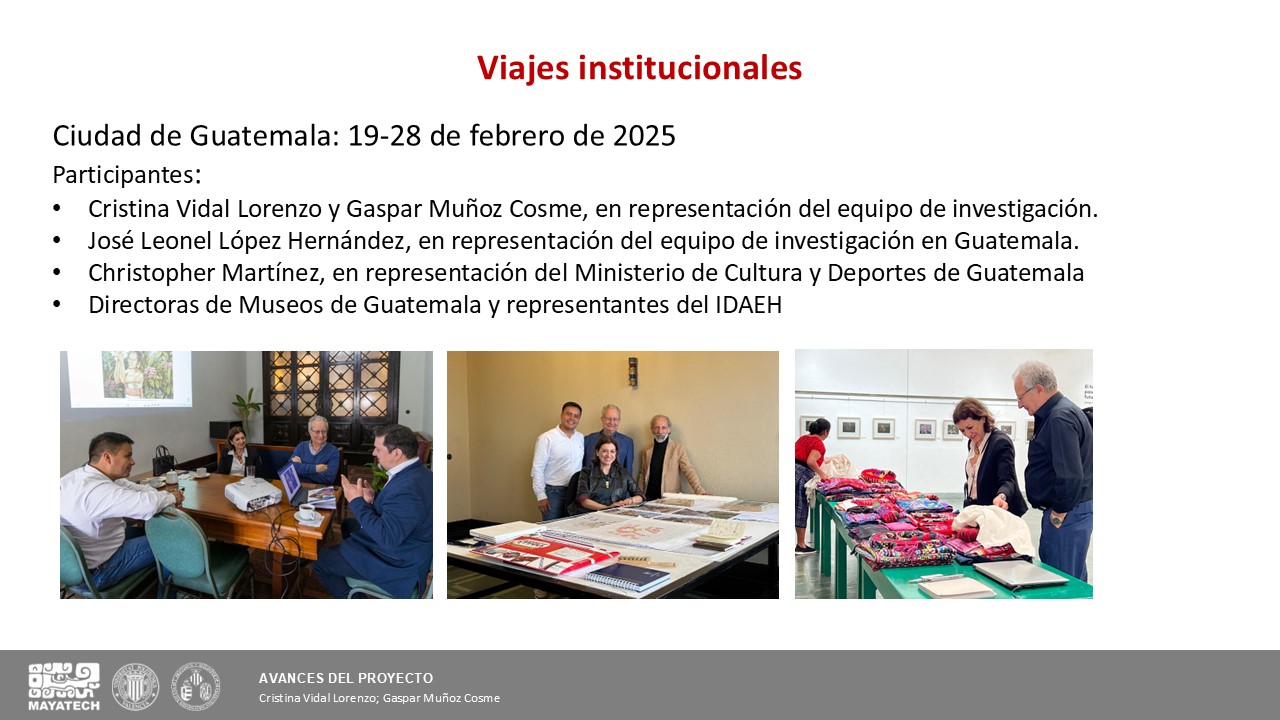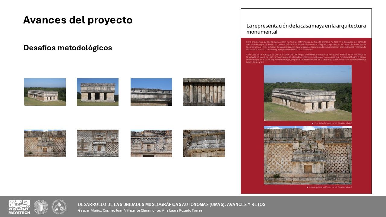 En la primera intervención se presentaron los avances del último año, con especial atención al trabajo desarrollado en México y Guatemala. En noviembre de 2024 se establecieron convenios con el INAH y Patrimonio del Estado de Yucatán, y en febrero de 2025 se celebraron reuniones con el Ministerio de Cultura y el IDAEH en Guatemala. Entre abril y mayo de 2025 se avanzó en la documentación del Grupo de las Columnas de Uxmal, se registró una casa maya en Santa Elena y se realizaron entrevistas a mujeres de la comunidad. También se llevaron a cabo encuentros con el Gran Museo del Mundo Maya y la Dirección General de Museos y Patrimonio de Yucatán, además de incorporarse tres técnicos y adquirirse nuevo material científico especializado.