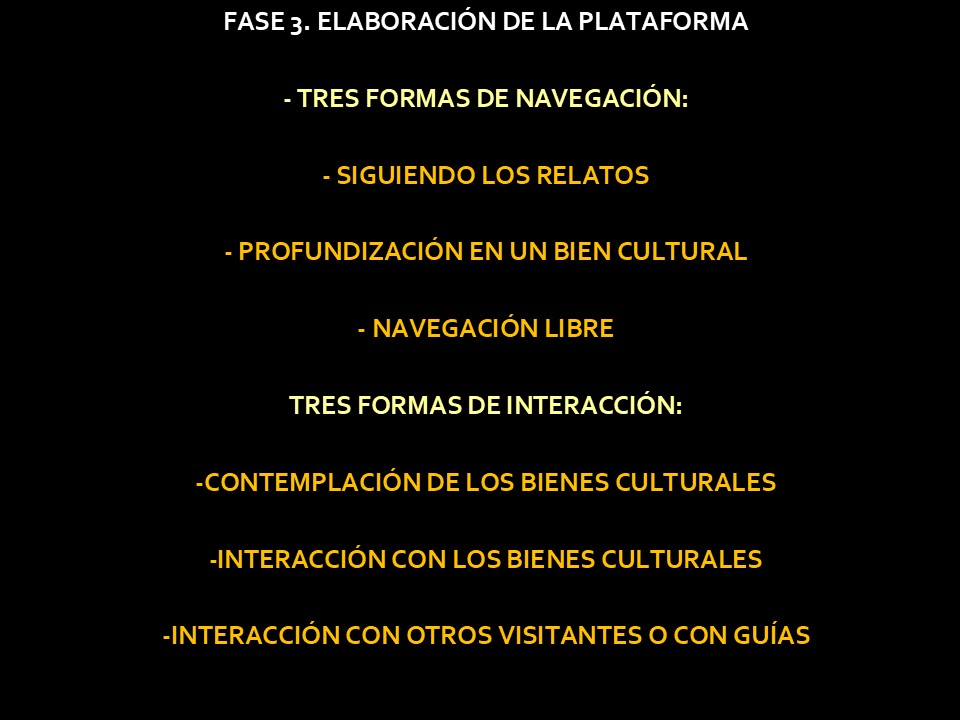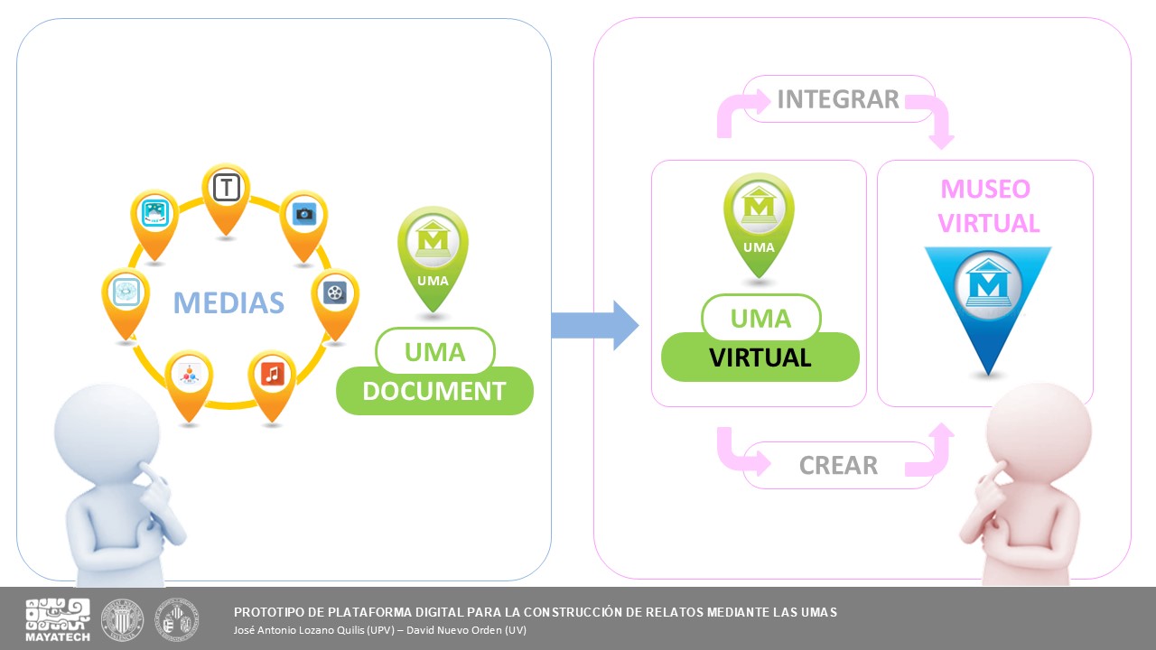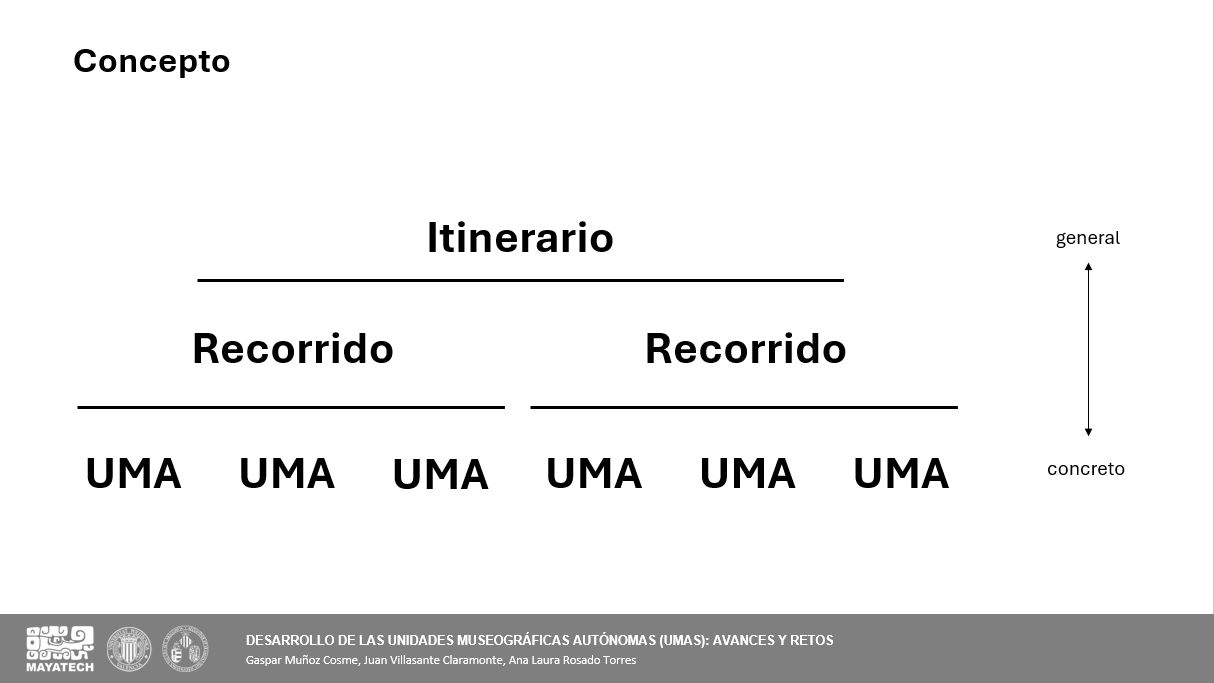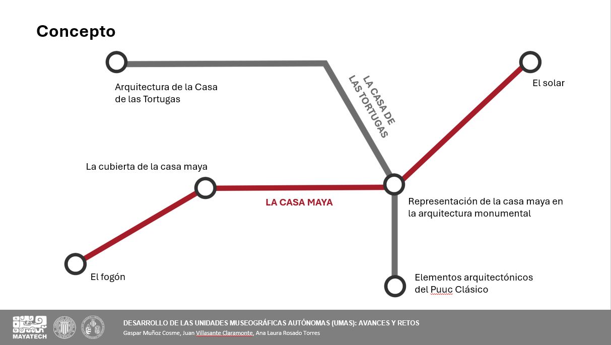 Se presentaron los conceptos básicos que deben regir y organizar el museo virtual. Este se basa en el esquema Itinerario → Relato → UMA, donde esta última es la unidad mínima que aporta información y con significado propio. El relato es una pieza fundamental pues permite organizar y entender conceptos amplios y transversales a la cultura maya.