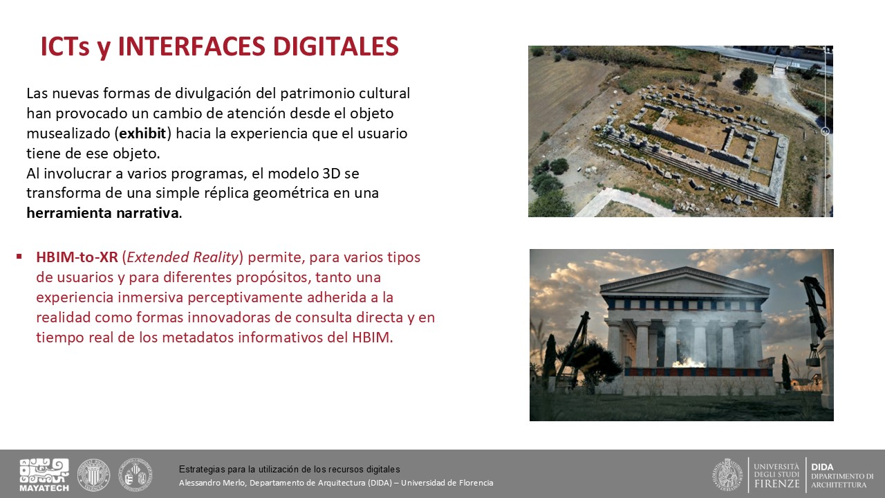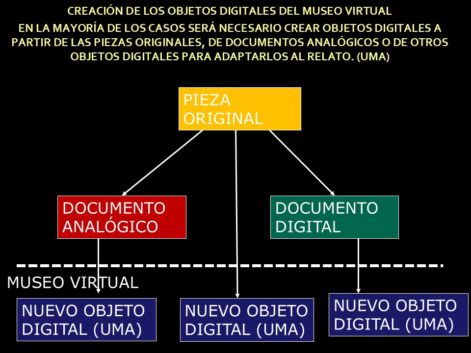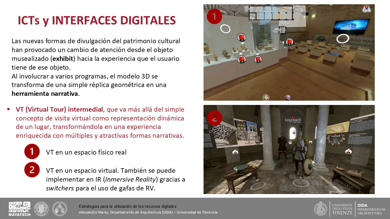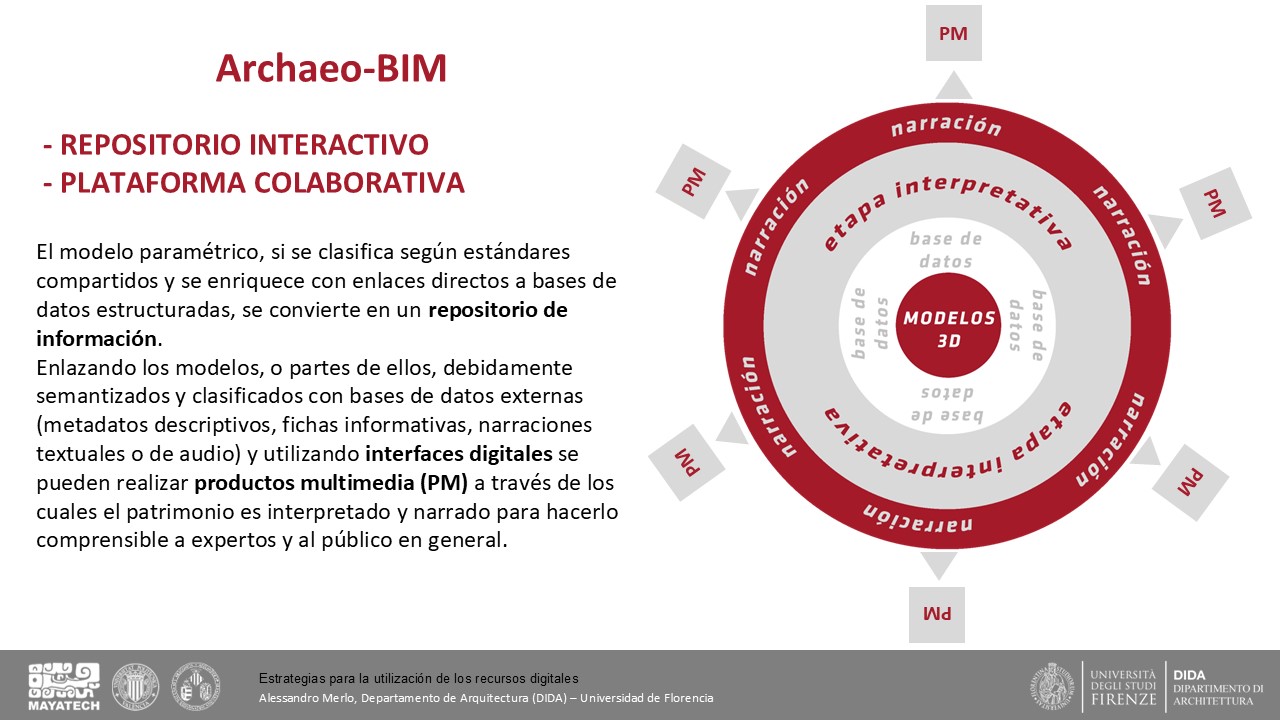 Se presentaron los conceptos básicos que deben regir y organizar el museo virtual. Este se basa en el esquema Itinerario → Relato → UMA, donde esta última es la unidad mínima que aporta información y con significado propio. El relato es una pieza fundamental pues permite organizar y entender conceptos amplios y transversales a la cultura maya.