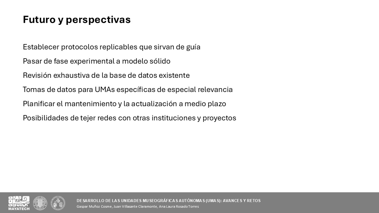 El archivo generado por la ahora Unidad Mixta de Investigación reúne más de veinte años de proyectos arqueológicos, con registros que comienzan en Oxkintok (1986) y destacan en el Proyecto La Blanca (2003–2019). Este valioso acervo presenta retos en su gestión y difusión debido a la diversidad de formatos y criterios de archivo. El proyecto Prometeo busca afrontar estos desafíos mediante la consolidación y estandarización del repositorio, garantizando su doble uso científico y divulgativo. Además, se plantea la creación de un equipo especializado que asegure la continuidad generacional y la preservación del conocimiento acumulado en estas décadas de investigación.