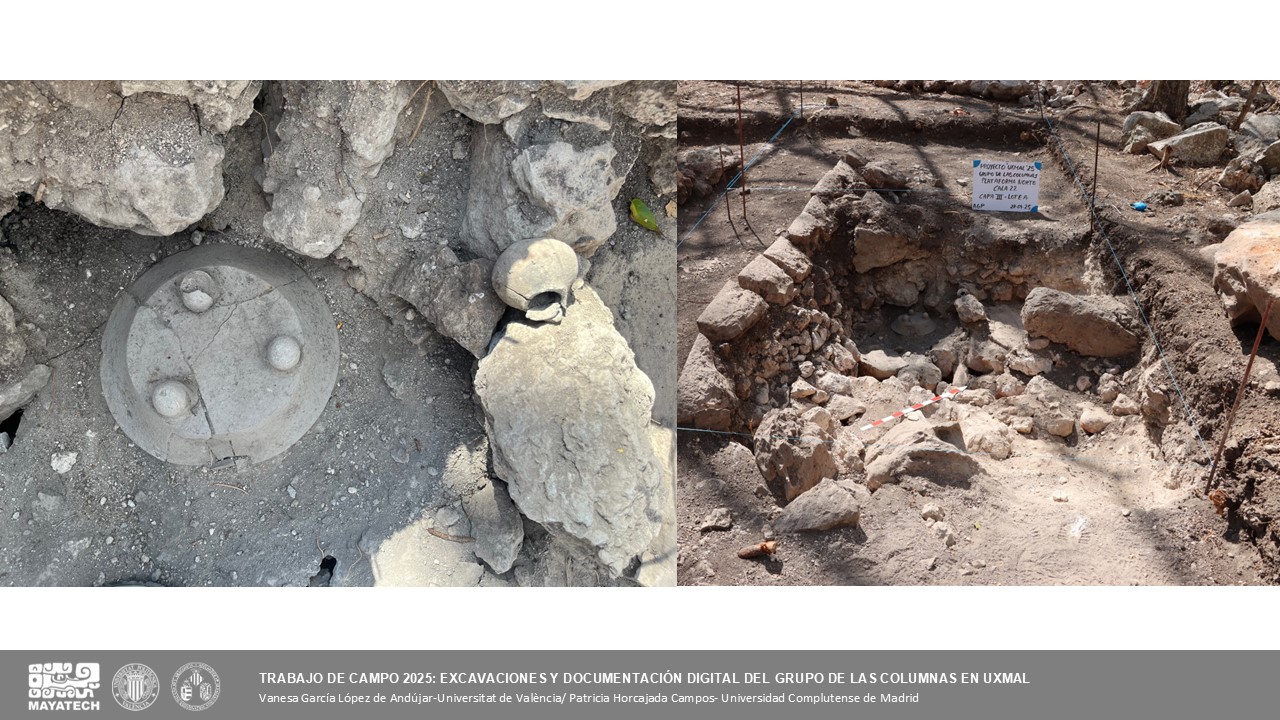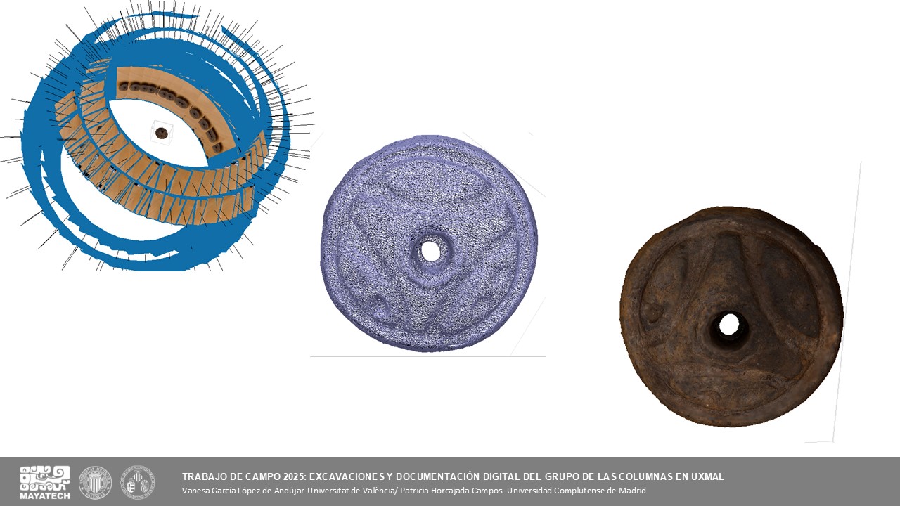 Se presentaron los avances de la temporada de campo 2025 en el Grupo de las Columnas de Uxmal, dentro del conjunto de trabajos iniciados en 2023 por el proyecto. Destacaron la consolidación de la escalinata y el uso de una metodología de registro digital basada en escáner láser, fotogrametría y documentación audiovisual. Entre los hallazgos más relevantes figura una ofrenda compuesta por un plato, una vasija miniatura y un malacate, pieza que conecta el trabajo arqueológico con futuras narrativas del Museo Virtual de la Cultura Maya.